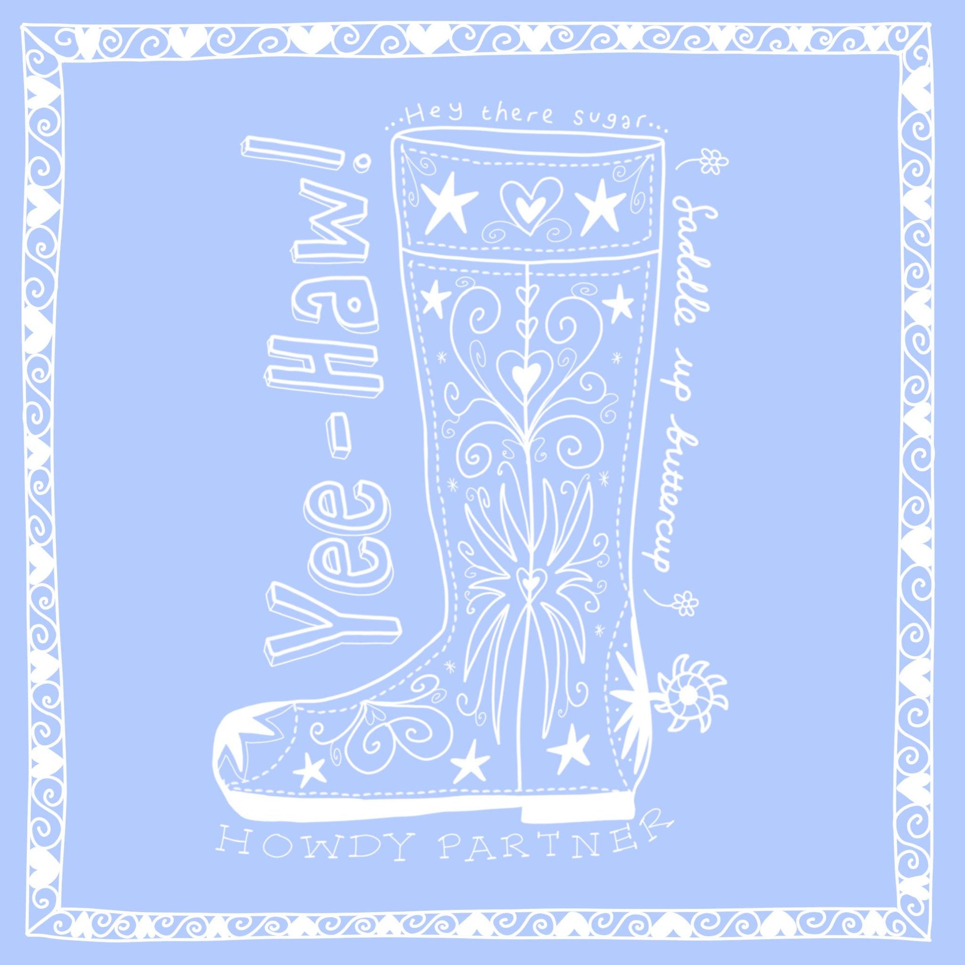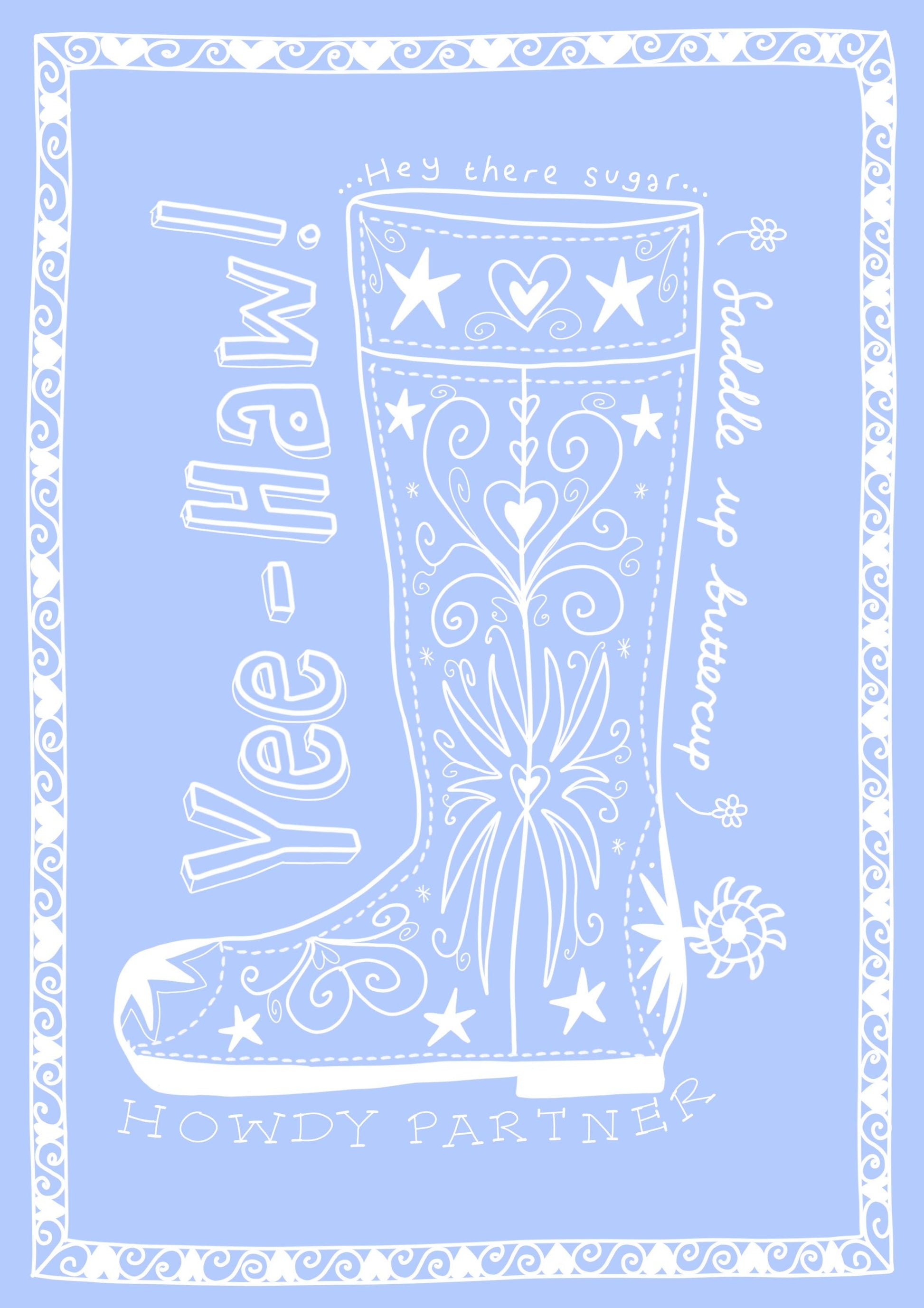 Yes-haw! A baby blue illustrated cowboy boot with the phrases: Howdy partner, saddle up buttercup and hey there sugar. Cute illustrations to brighten up your walls.