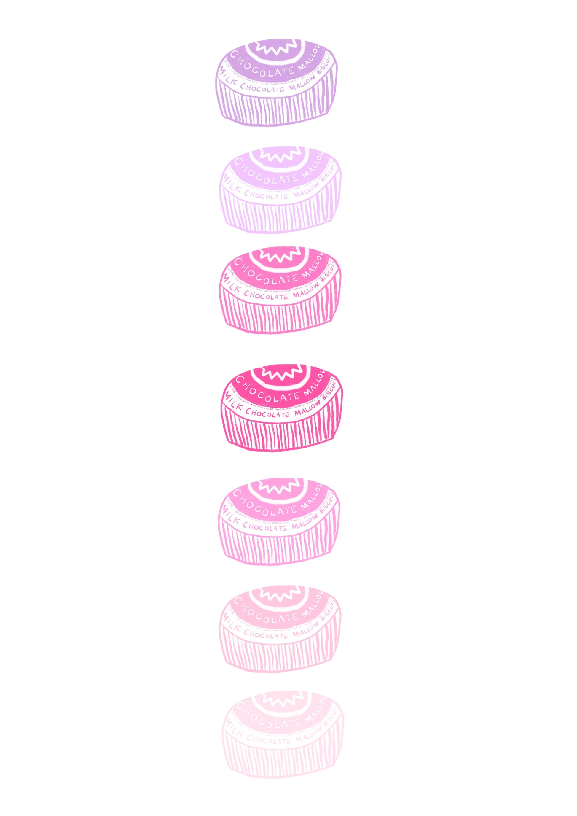 Experience the joy of a Tunnock's Teacake rainbow with this vibrant illustration! This captivating artwork showcases the iconic teacake in a delightful spectrum of pink, creating a visual feast that's as whimsical as it is delicious. Each teacake is a burst of joy, celebrating the classic treat in a kaleidoscope of pink hues. Perfect for those who love a playful twist on tradition, this rainbow of Tunnock's Teacakes adds a pop of colour and sweetness to any space. Elevate your surroundings with the lively charm of this teacake rainbow – a delightful homage to the timeless joy of Tunnock's confections! The squishiest most wonderful mallows around.
