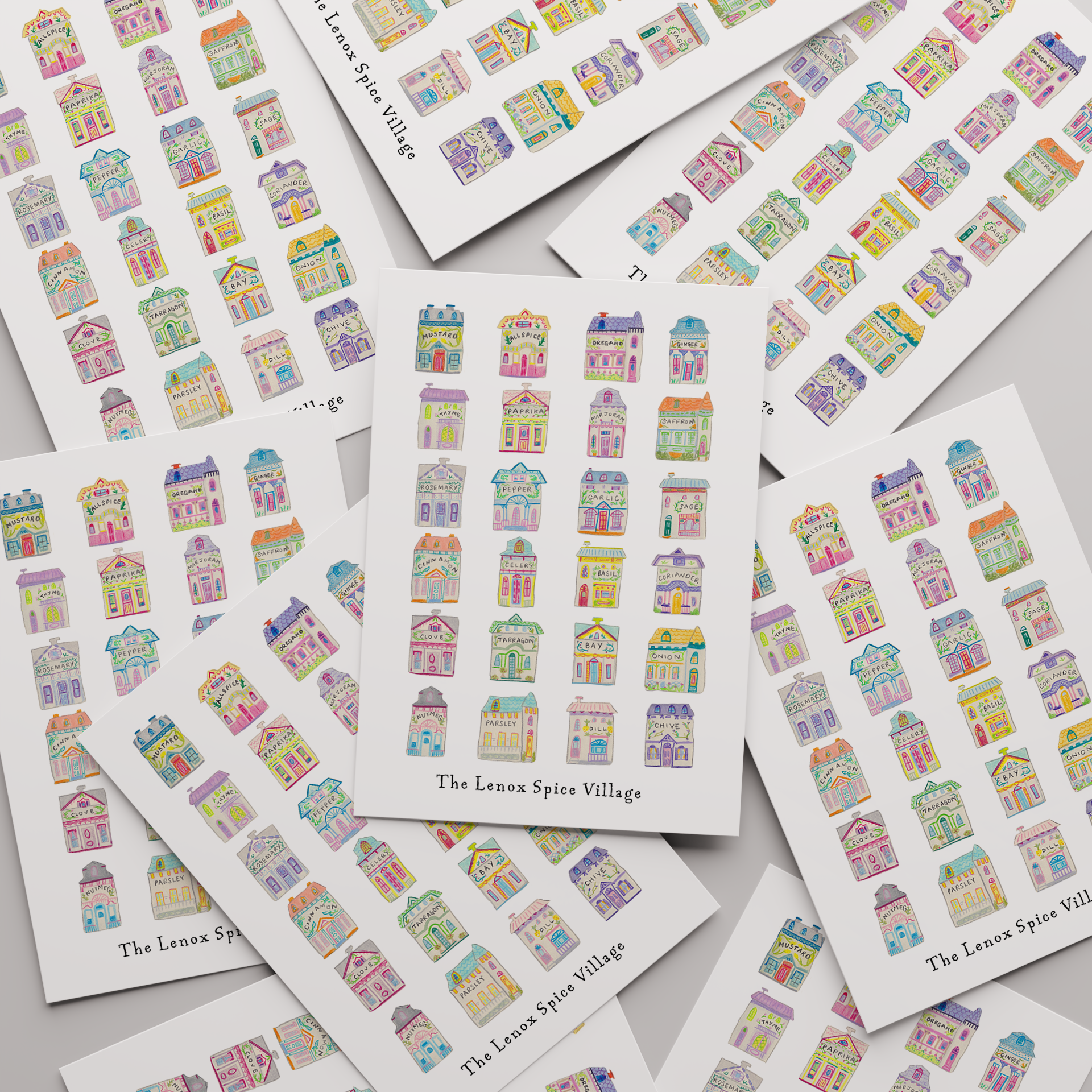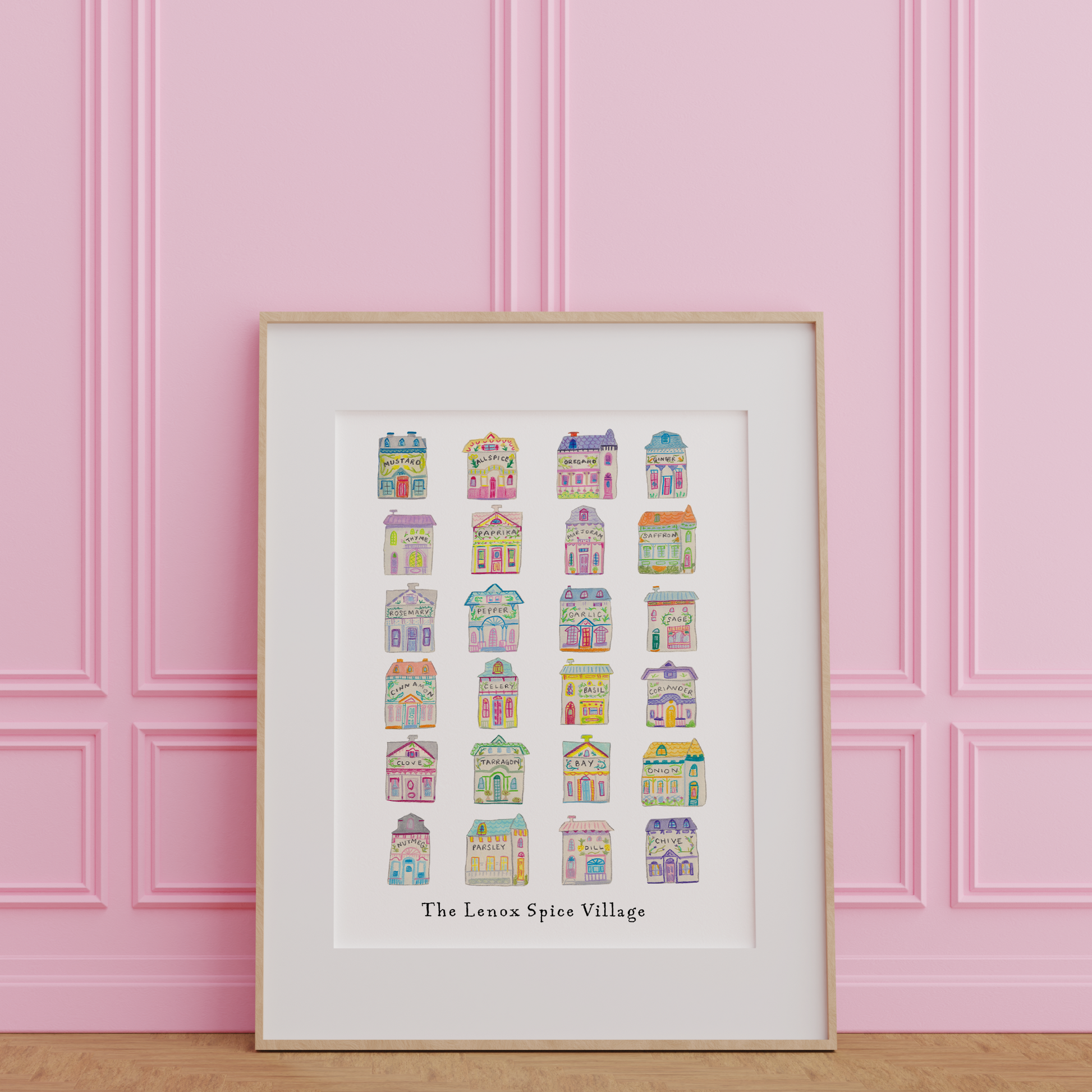 This full-colour pencil drawing captures all 24 Lenox Spice Village buildings in one bustling scene. Each little house drawn and coloured by hand, then lovingly scanned so every hue sings on paper.