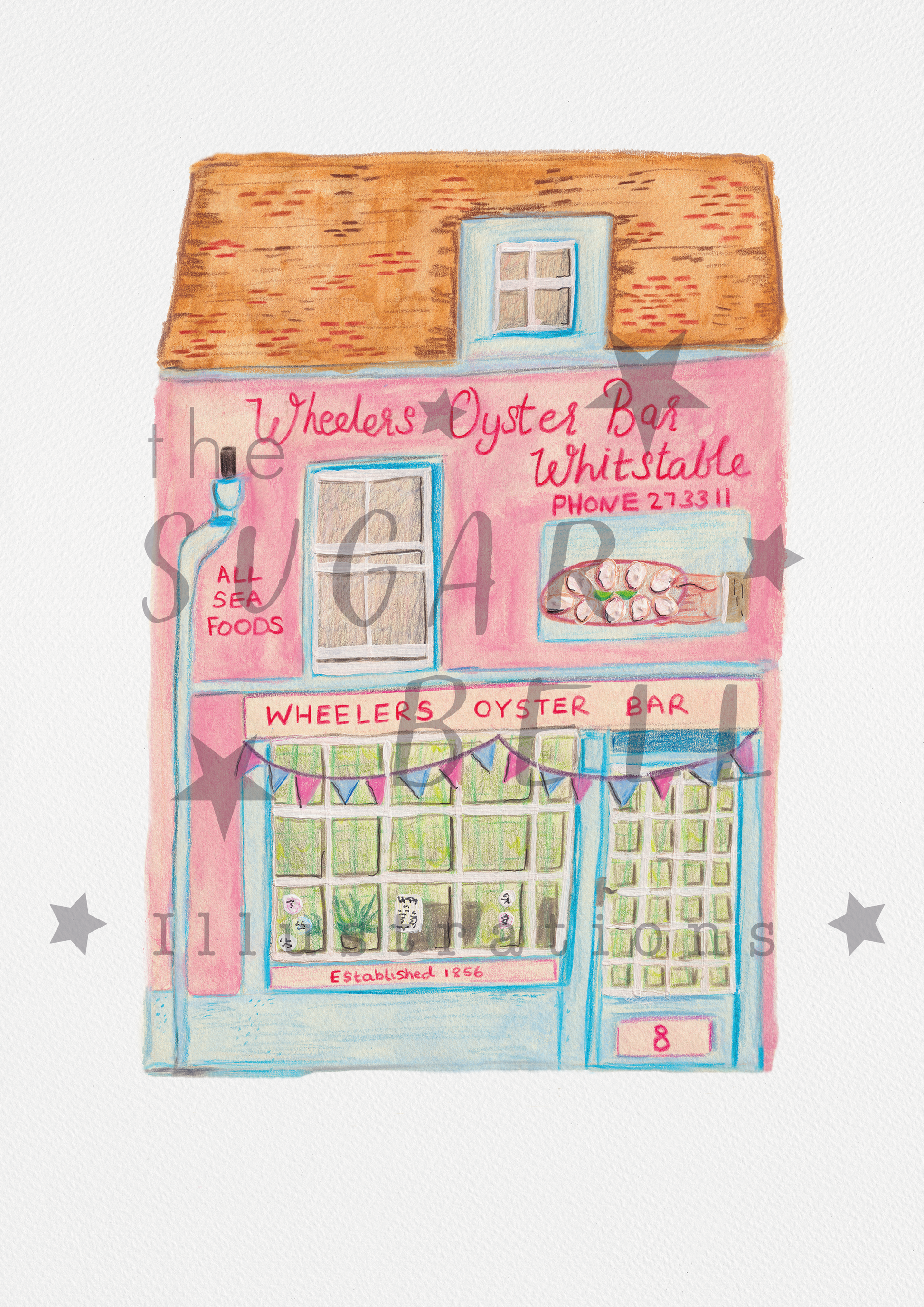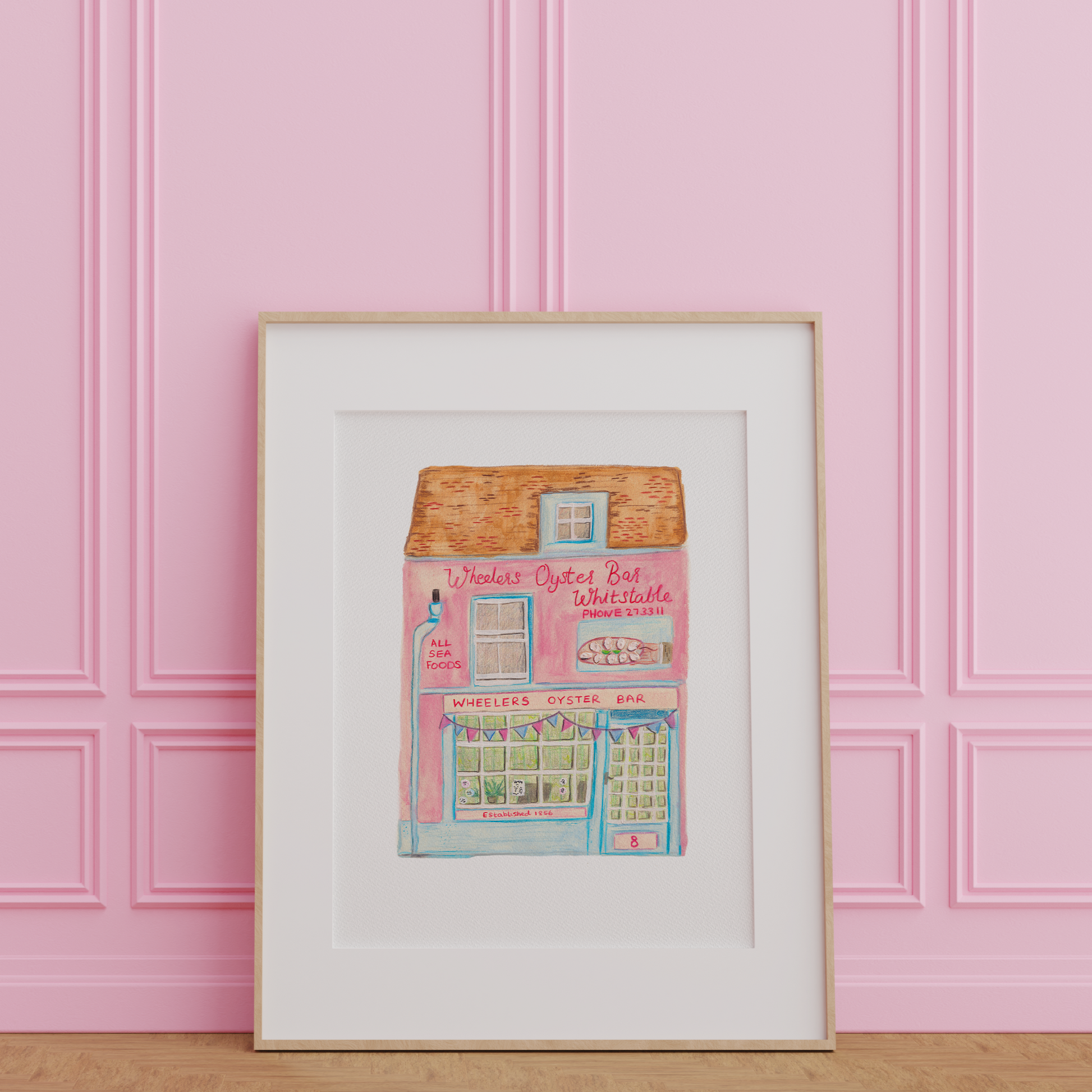 Celebrate the charm of the British seaside with this art print of the famous Wheelers Oyster Bar in Whitstable, Kent. The iconic pink shopfront has been lovingly illustrated using Caran d’Ache Neocolor, Holbein coloured pencils, and Holbein gouache, then scanned to create a crisp, high-quality print that captures every detail of the original artwork.